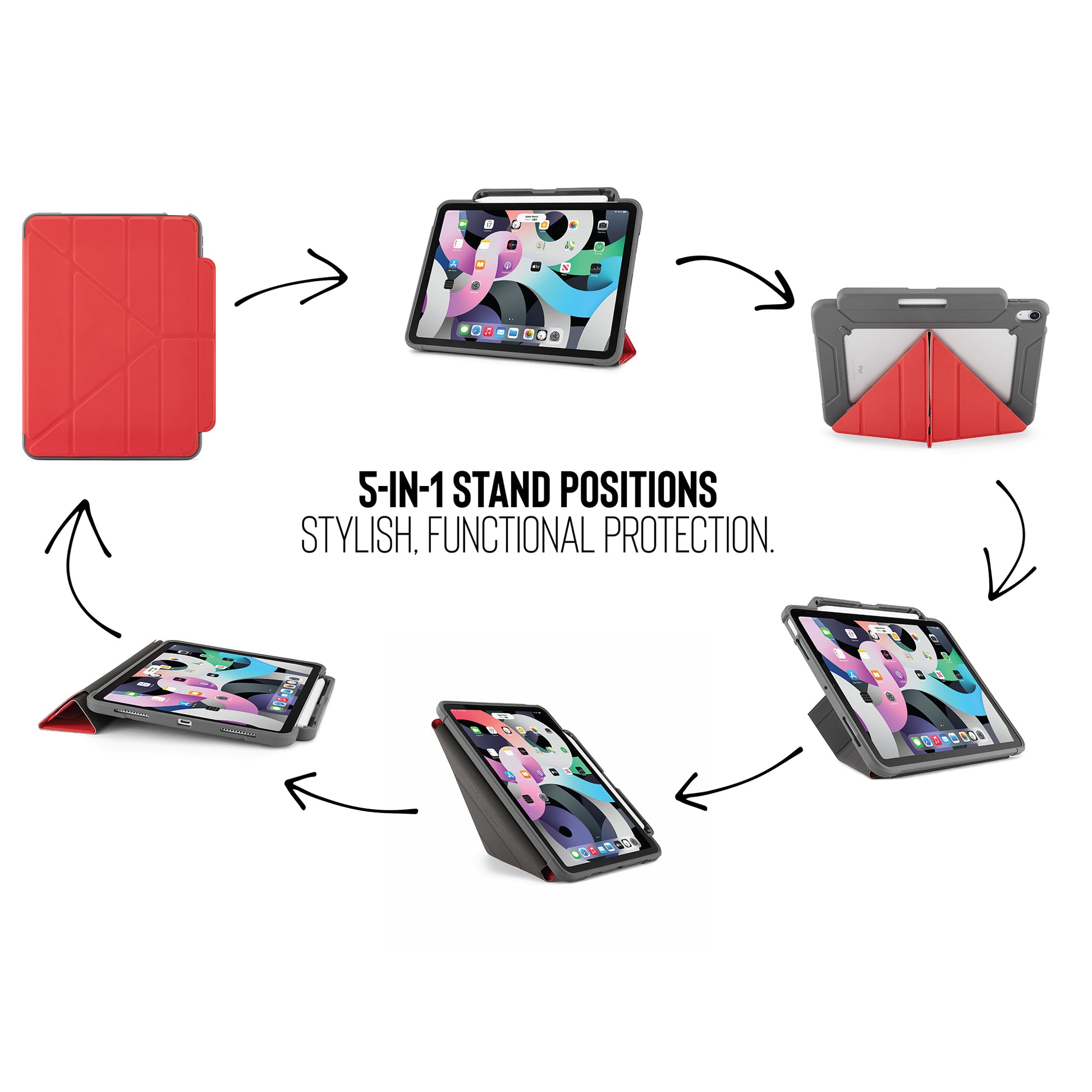 ✅ 5-IN-1 STAND POSITIONS - 2x Stand positions for typing and viewing; 2x additional wide-base positions and 1x further portrait position.